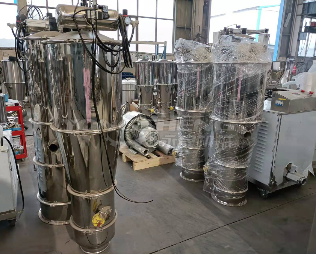真空上料机的固态物料、聚合物凝胶以及液滴等粒子尺寸减小的过程统称为“分散混合”。为达到所要求的产品质量规格,在典型的真空上料机加工过程中,都存在分散混合作用,它主要有以下几个作用: