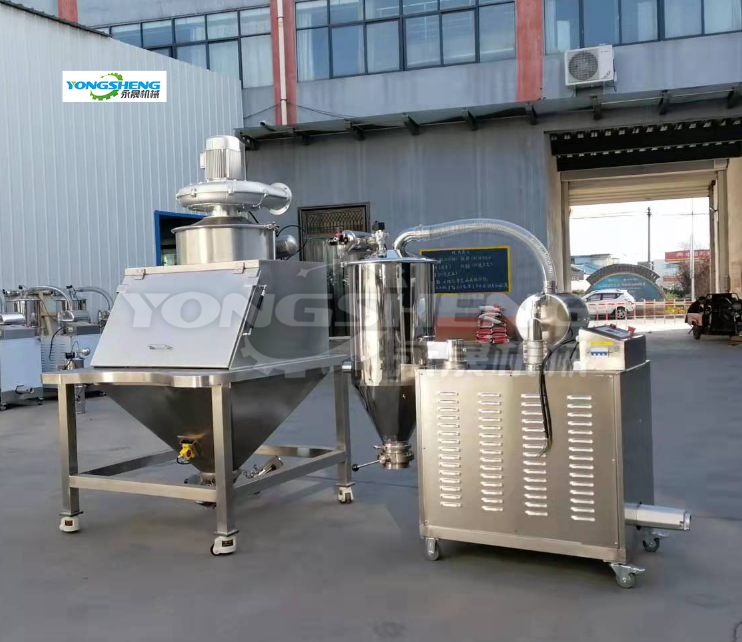对于精细化工、食品行业,这种小型的密封无尘设备,厂家接触的更多,经验也相对比较丰富,使用无尘投料站来解决车间粉尘问题。人工投料也免不了有线头,合格证等异物的落入,在无尘投料站下方设计使用除杂振动筛来将杂质筛选出去,筛选出来的物料抽进真空上料机料筒中,在混合机进料口位置排料放进混合机中。整个环节没有粉尘遗漏的现象。