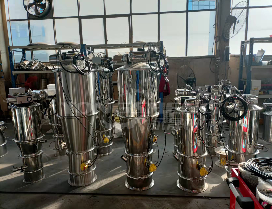 同时,储存在气包空气中的压缩空气反吹过滤器,过滤器自动清洗;时间后(放料时间,可调节),压缩空气重新启动,气动真空泵产生真空,放料门关闭,真空上料机再次加料,周而复始,物料被源源不断地送入受料设备中。