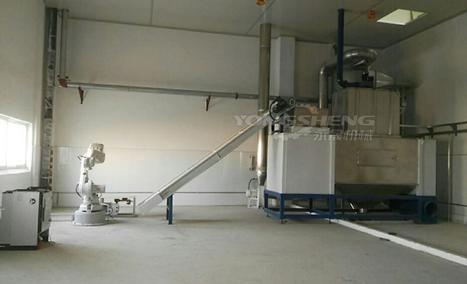 设备系统的工艺流程是:人工将物料投入小袋投料站,或者利用吨袋卸料站卸料,物料经真空输送设备输送至称重计量罐,电气控制系统控制喂料器将物料指定混合设备,采用的是失重秤原理。计量精度高通常能达到0.1%的误差。物料经过计量达到混合机进行混合。混合后的物料落入缓存灌再次使用真空上料机输送到指定设备。