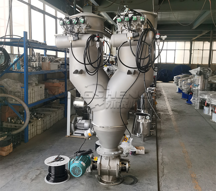 双胞胎真空上料机,又称双头真空吸料机,双仓滤芯式负压输送机。 这是一款专门针对石墨炭粉原料特性,为锂电池负极材料研发生产的真空吸料机。有效解决了石墨碳粉或其他超细粉末容易堵滤芯的常见问题。