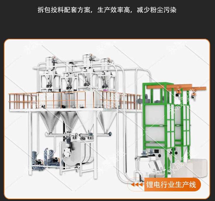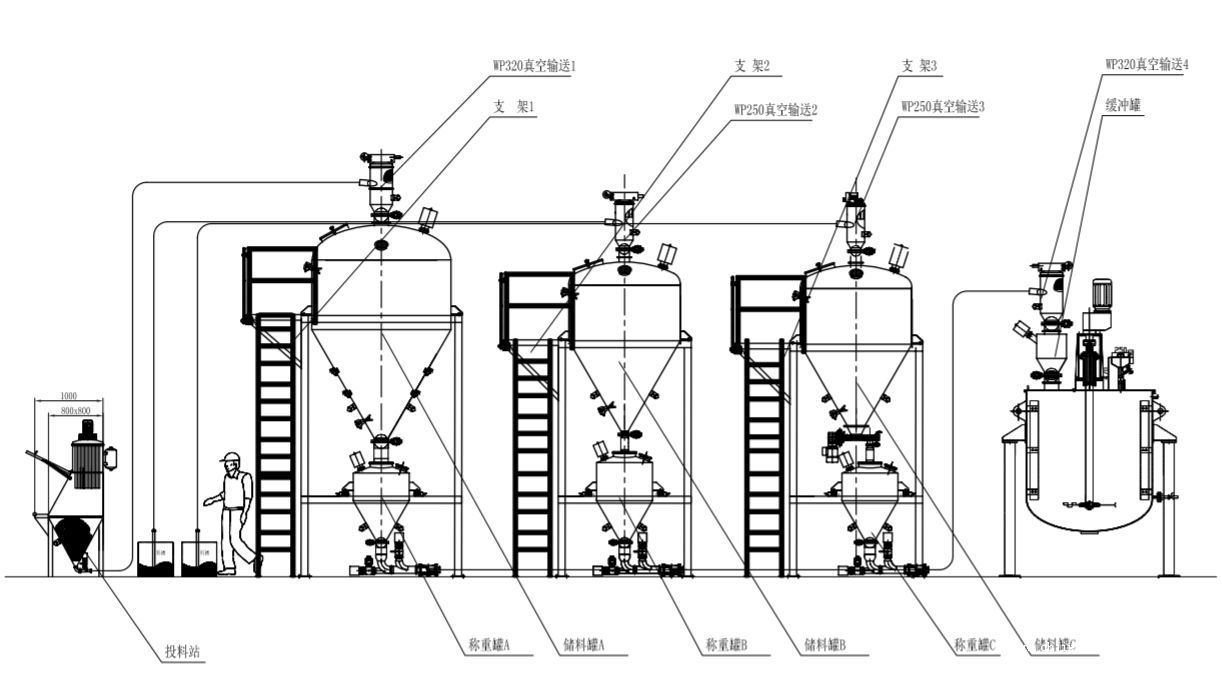 采用自动投料,高精度的除尘装置和密封管道输送方式,做到投料无粉尘,保证车间整洁