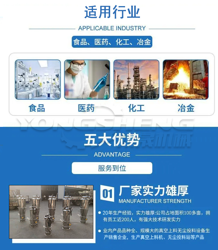 适用行业:真空加料机解决了加料时粉尘外溢等问题,是化工厂、冶金厂、制药厂、食品厂等行业通过GMP认证,促进文明清洁生产的设备。